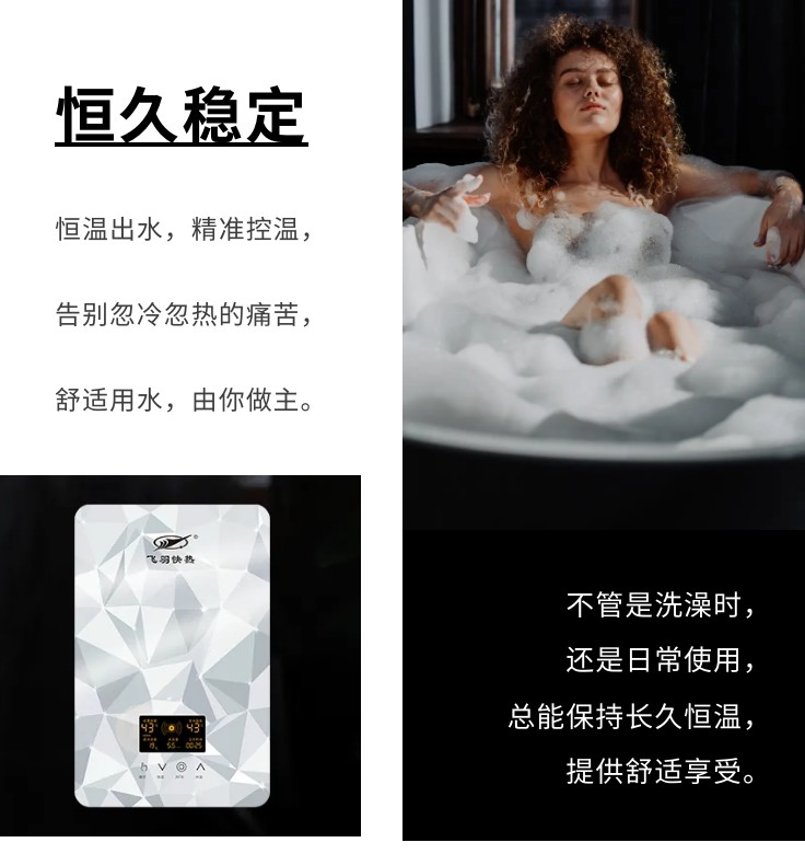 很多人在追求“溫而不熱”上有自己的偏好。每到夏天,沐浴時(shí)水溫過(guò)燙自然是不行的,冷水更談不上舒適,往往以溫?zé)釣榧选C總€(gè)人都有屬于自己的個(gè)性需求,飛羽快熱即熱式電熱水器都能滿(mǎn)足。