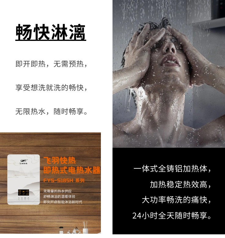 飛羽快熱即熱式電熱水器,采用一體式全鑄鋁加熱體,安全穩(wěn)定熱效高,通過(guò)大功率的加熱,真正實(shí)現(xiàn)即開(kāi)即熱的效果。當(dāng)你擰動(dòng)水龍頭時(shí),熱水傾瀉而出,溫暖即用即有,告別無(wú)用的等待。