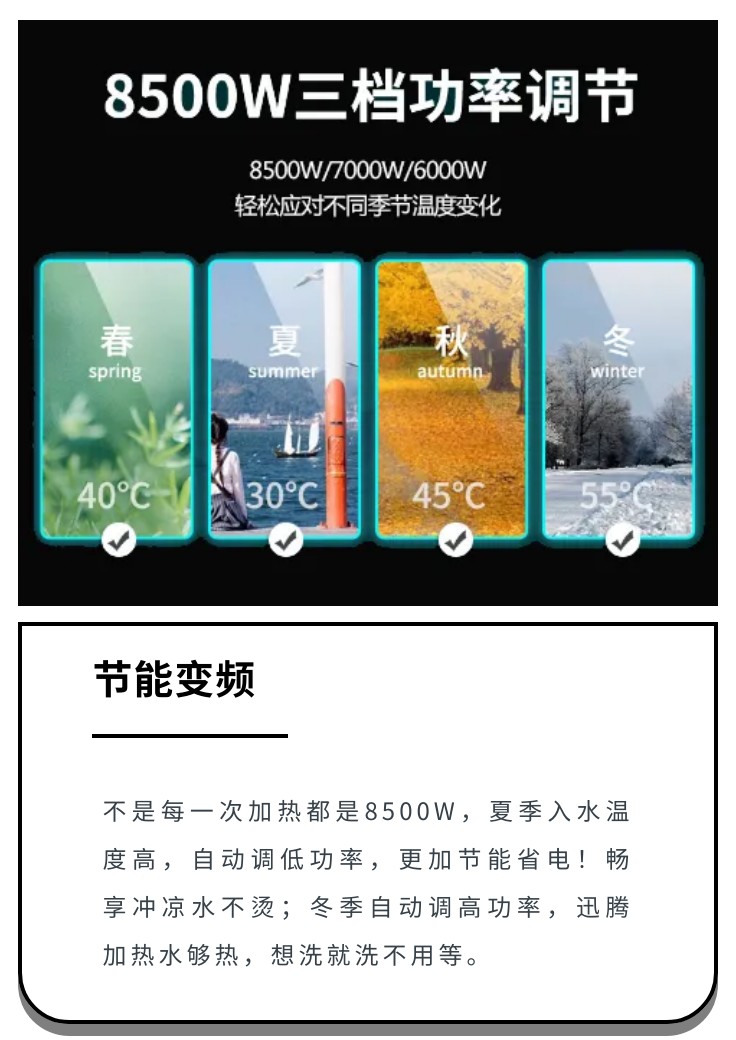 飛羽快熱即熱式熱水器,通過(guò)智能變頻恒溫系統(tǒng),智能芯片隨時(shí)感應(yīng)進(jìn)出水溫度和水流量,自動(dòng)調(diào)節(jié)加熱功率,解決溫度波動(dòng)的問(wèn)題,實(shí)時(shí)調(diào)控水溫,告別忽冷忽熱。