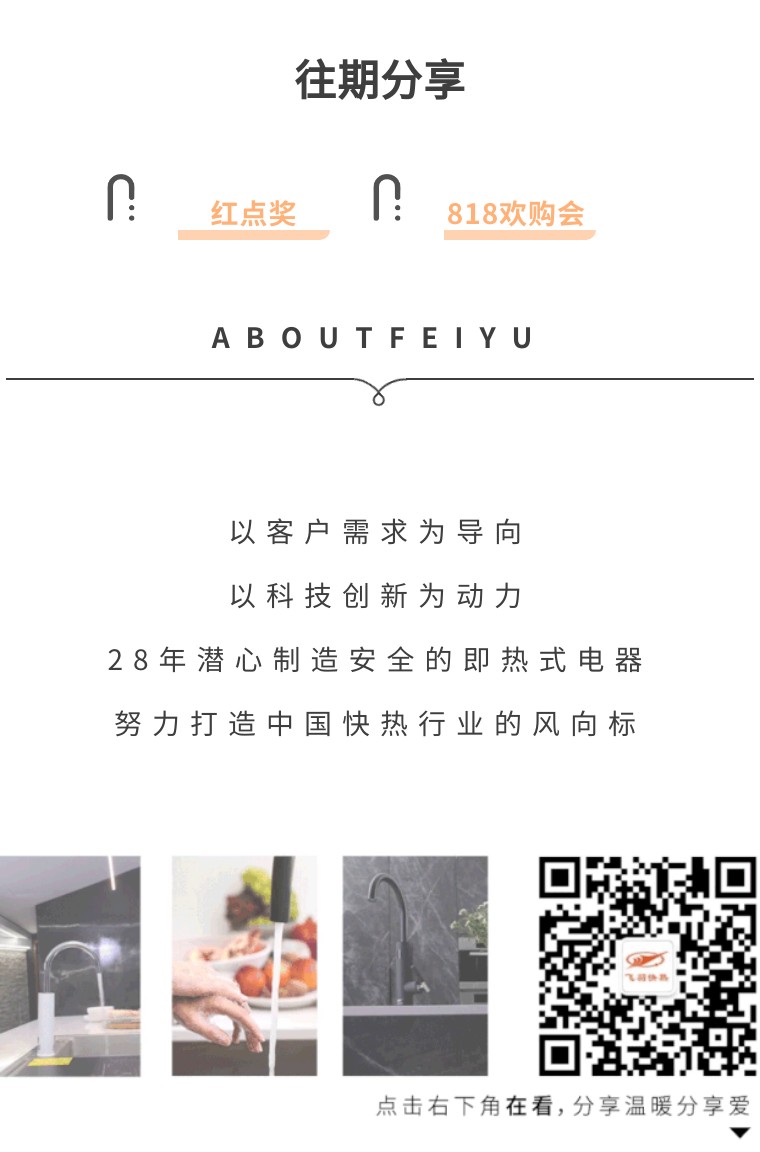 現如今,飛羽快熱的電熱水龍頭經過一層層的升級迭代,采用兼具纖細身材和高效性能的“霆芯?高性能安全內膽”,加熱不再需要再像20年前那樣等待十幾秒,而是“龍頭一開,熱水即來”。