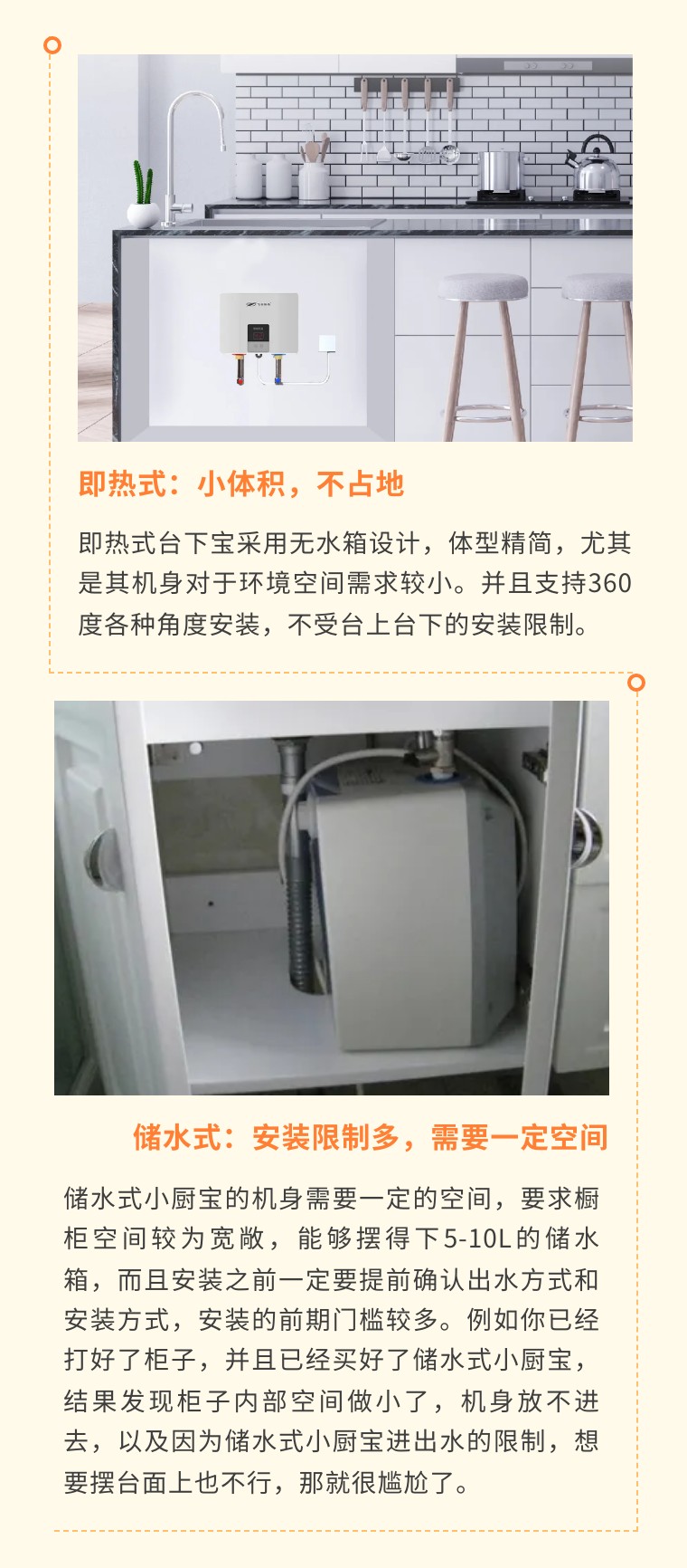 儲水式廚寶和即熱式廚寶都是裝在廚房里面,一般都是裝在水槽下方,盡量靠近出水端,提升了熱水傳輸?shù)睦寐省p少了傳輸過程中的熱量散失,也減少了每次使用前排冷水的水費。