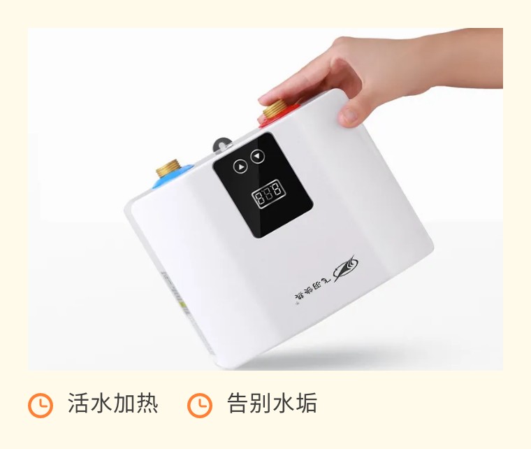 而即熱式采用的是活水加熱,冷水直接通過加熱體后便被加熱,水垢也不易形成,使用壽命比儲水式的小廚寶更長,用水也更健康放心。