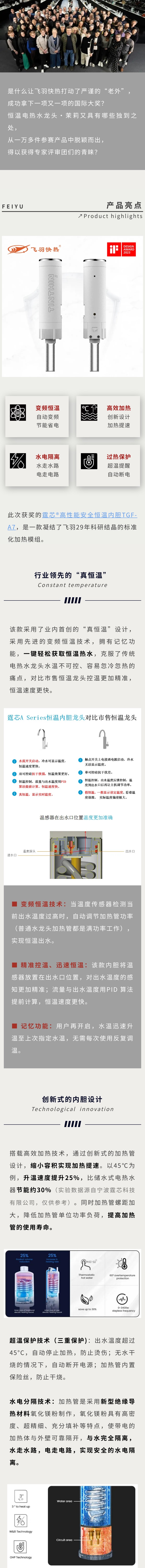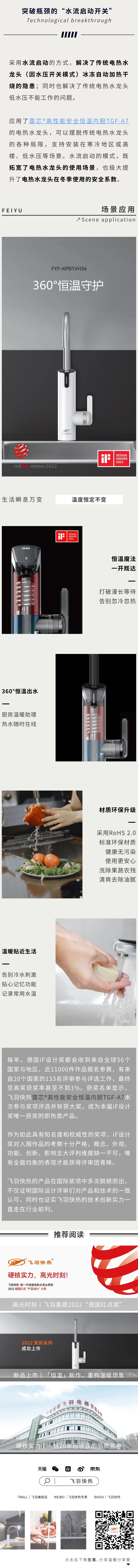 早在2022年,飛羽快熱恒溫電熱水龍頭·茉莉便已斬獲德國紅點產品設計大獎(REDDOT WINNER 2022),成為第一臺榮獲國際獎項的電熱水龍頭;次年,霆芯?高性能安全恒溫內膽TGF-A7榮獲德國iF設計大獎(iF DESIGN AWARD 2023),此次更是國際對于飛羽科研實力的雙重肯定,證明飛羽快熱是電熱水龍頭當之無愧的“行業引領者”。