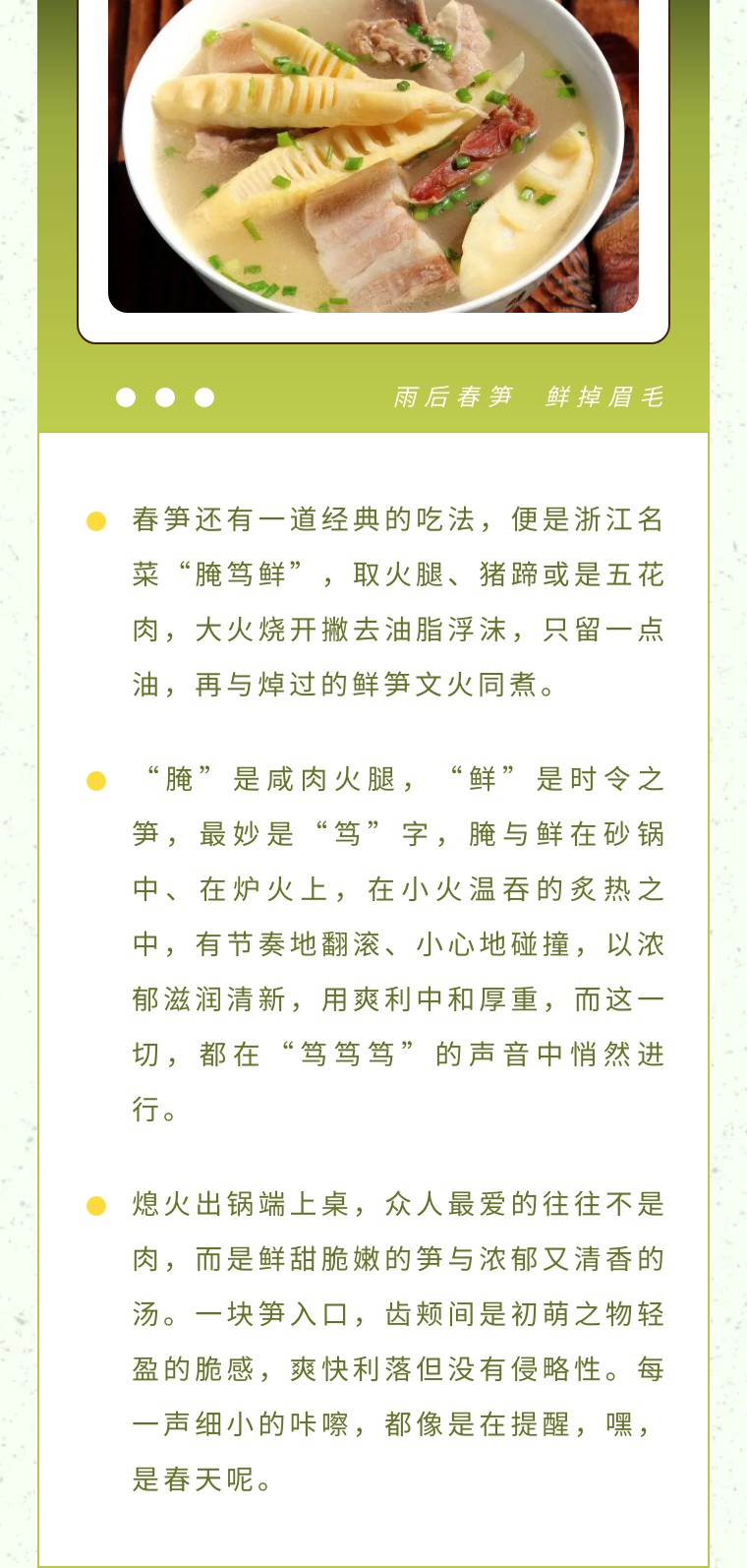 短短幾十天的嘗鮮期,其脆爽、清甜,卻讓吃客們難以抗拒、食之難忘。南方有一句話:“食過春筍,才方知春之味”。