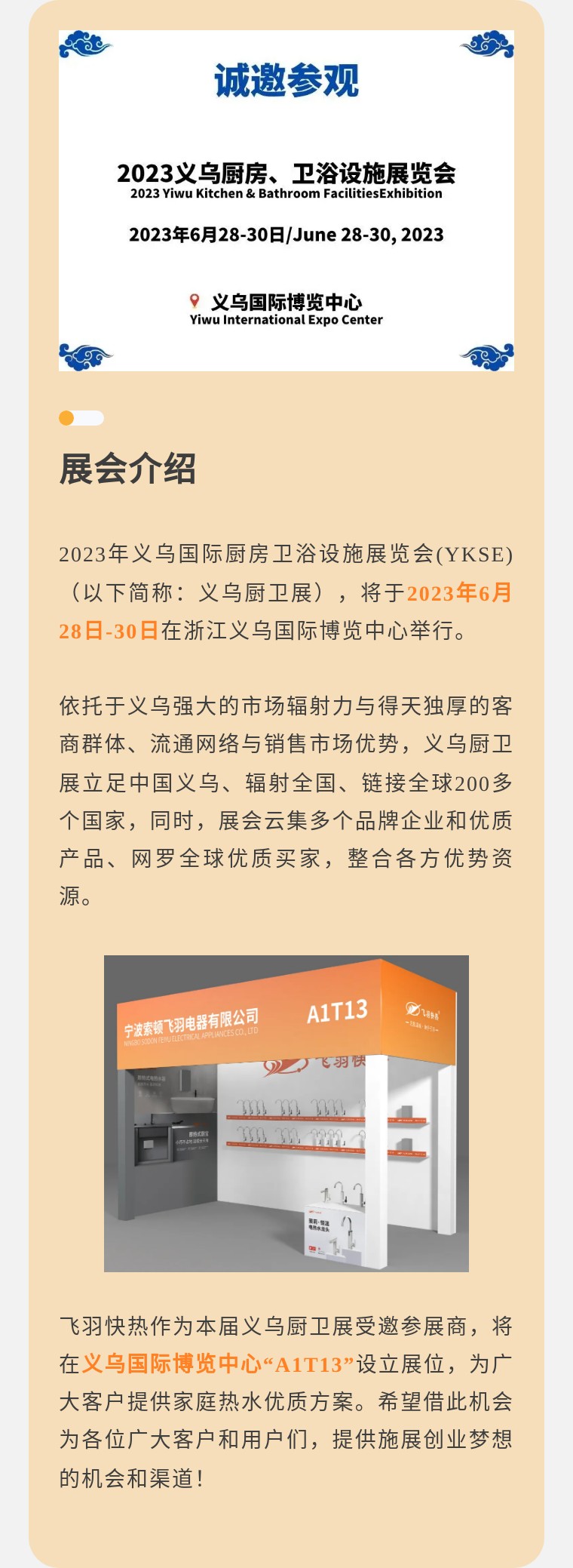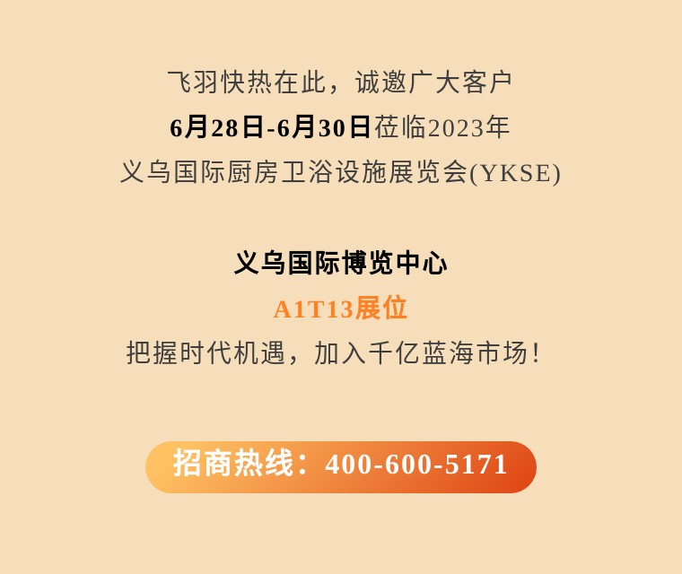 2023年義烏國際廚房衛浴設施展覽會(YKSE)(以下簡稱:義烏廚衛展),將于2023年6月28日-30日在浙江義烏國際博覽中心舉行。飛羽快熱作為本屆義烏廚衛展受邀參展商,將在義烏國際博覽中心“A1T13”設立展位,為廣大客戶提供家庭熱水優質方案。希望借此機會為各位廣大客戶和用戶們,提供施展創業夢想的機會和渠道!